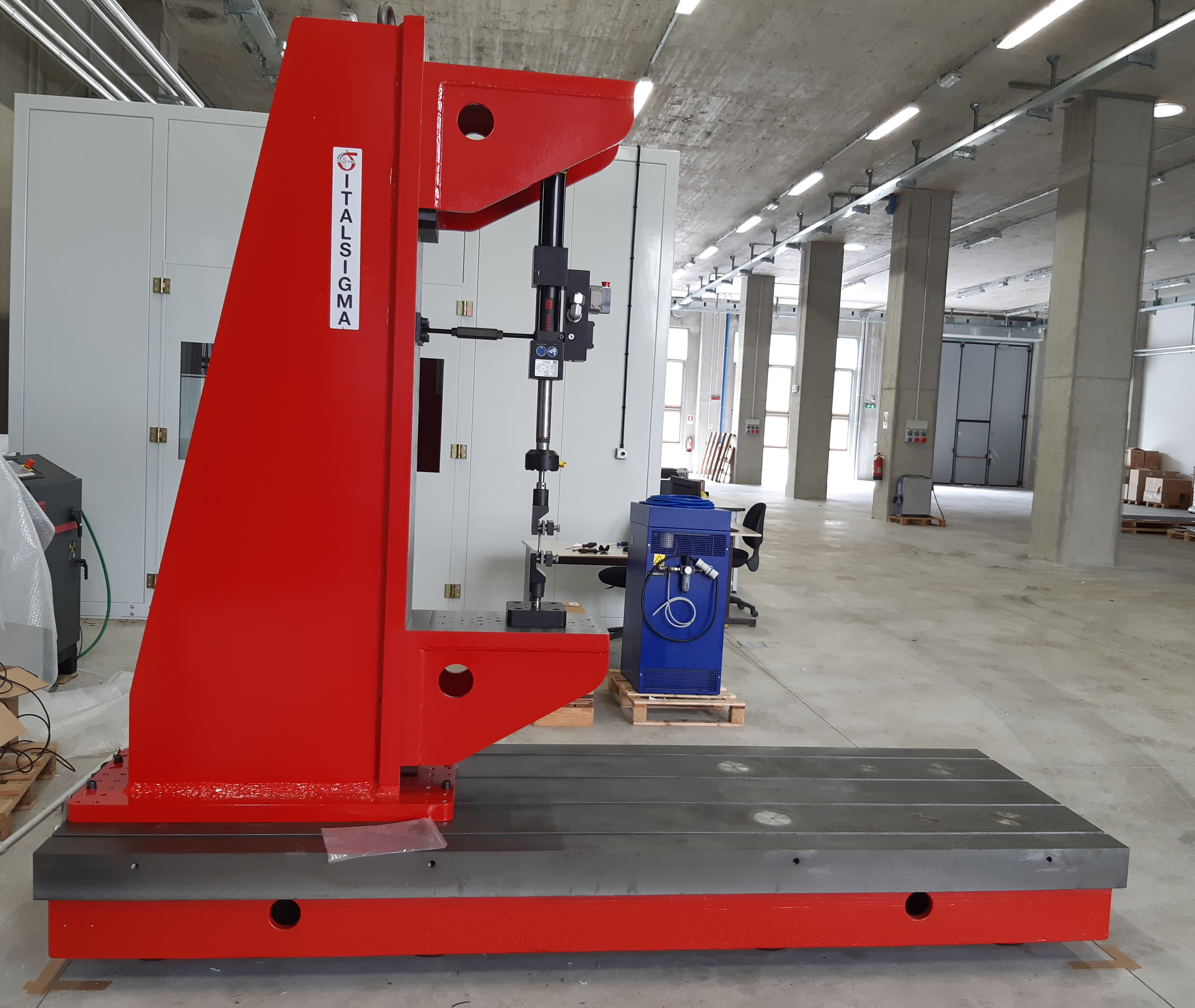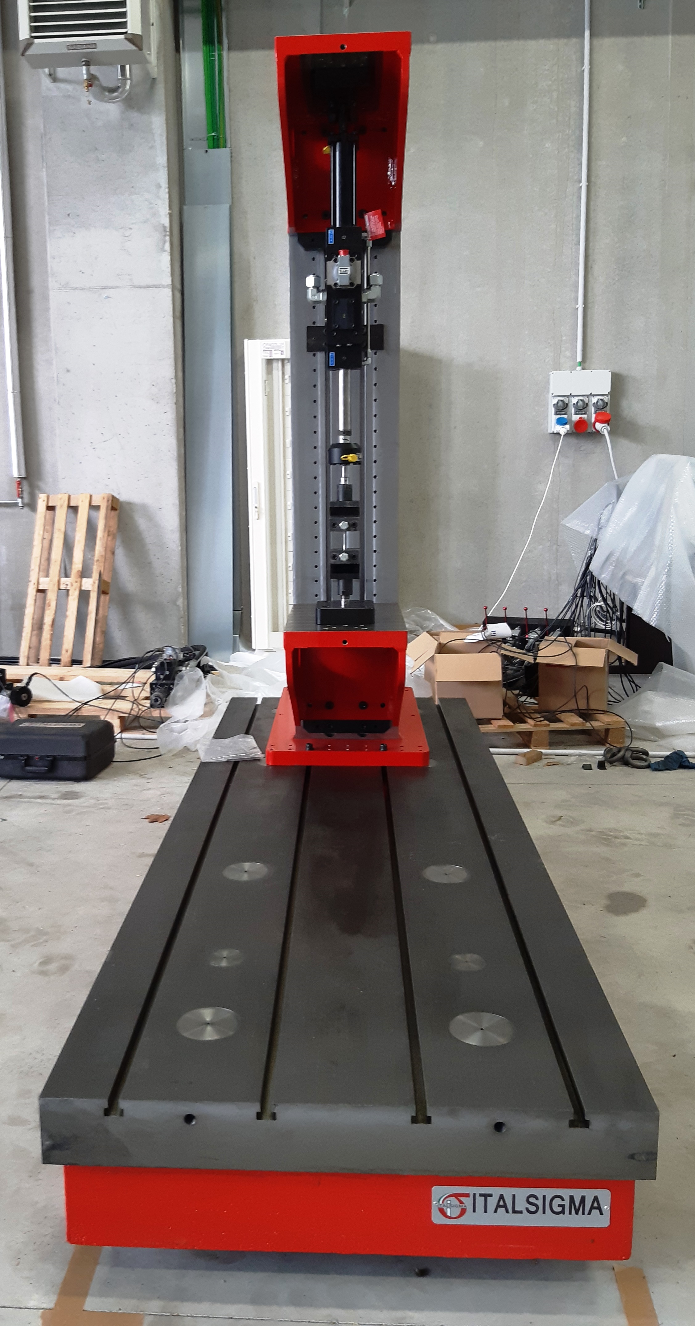 Completano il telaio, due robuste travi longitudinali di collegamento dei portali, sulle quali, in caso di necessità di prova, possono essere fissati i cilindri di carico.
