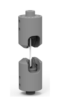 Mechanical grips for flat and/or round specimens, which operate on the screw clamping principle. These grips are made of 39NiCrMo3 hardened steel, with burnishing surface treatment suitable for fatigue tests with loads up to 20 kN and knurled clamping system.