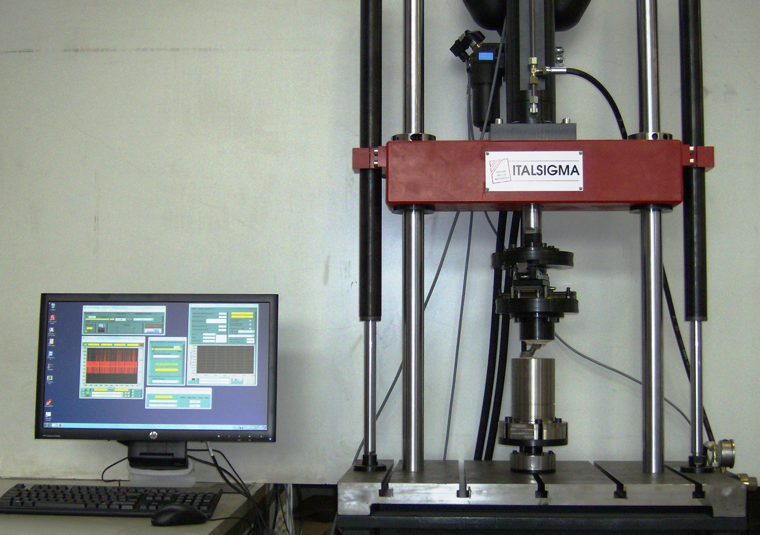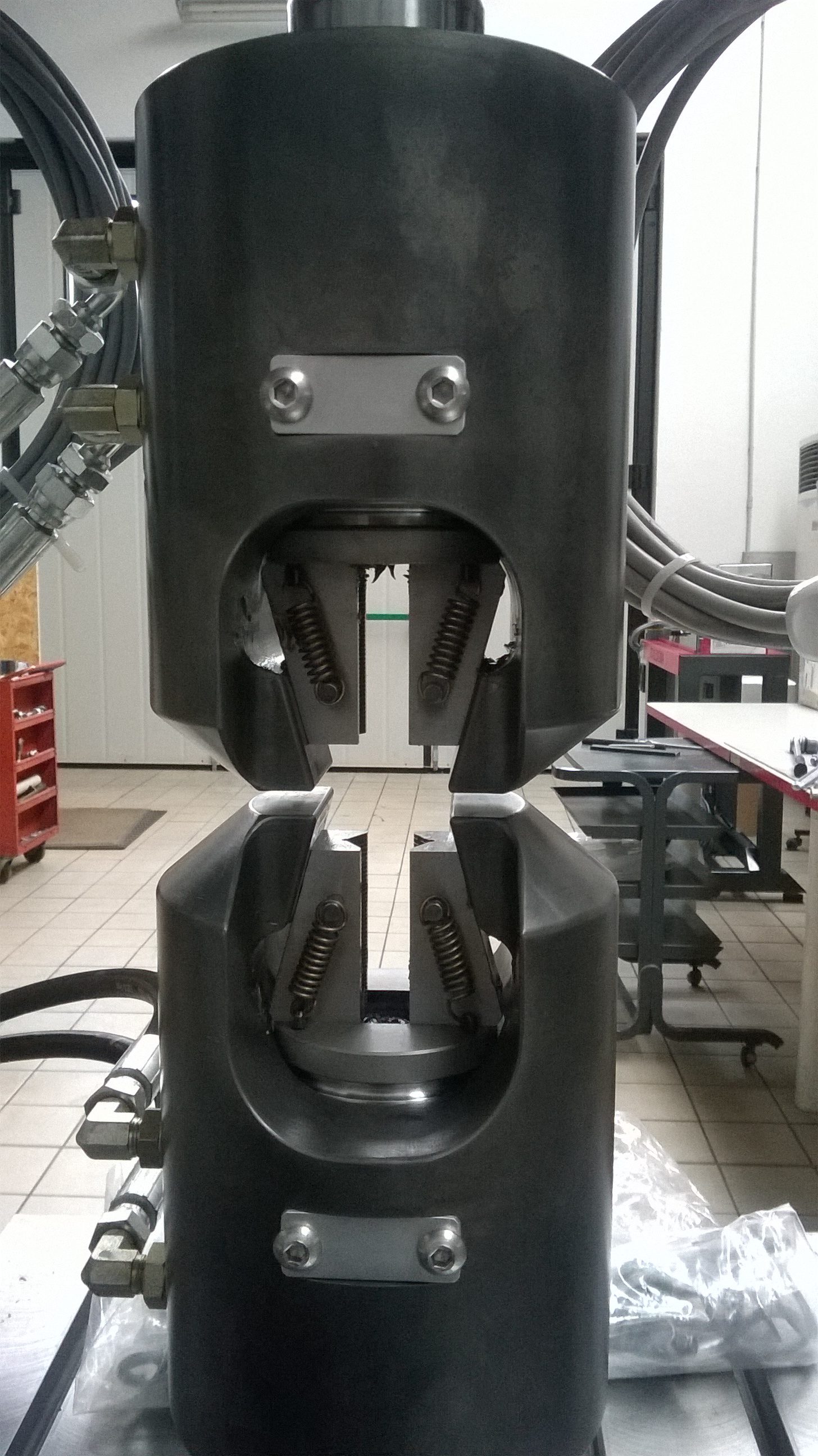 Self-centering wedge-shaped hydraulic grips made with a single steel body, suitable for tensile and compressive stresses and for load cycles around zero with forces up to 100 kN.