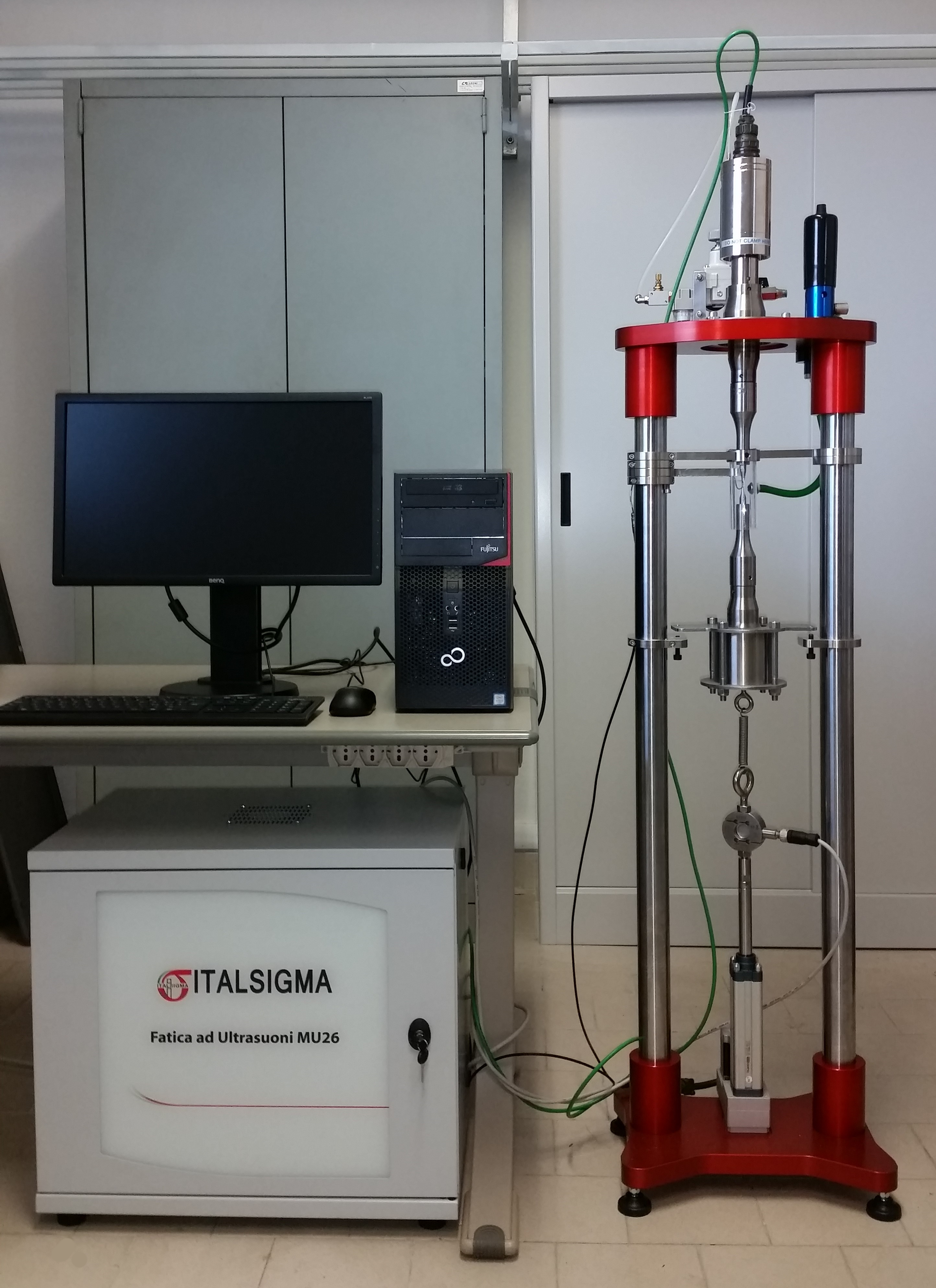 Electromechanical testing machine with an ultrasonic system for stress generation and a load frame with electromechanical actuator to generate static stresses. Command, control and management from Personal Computer.