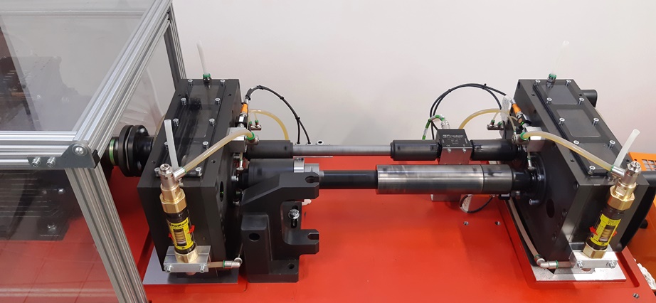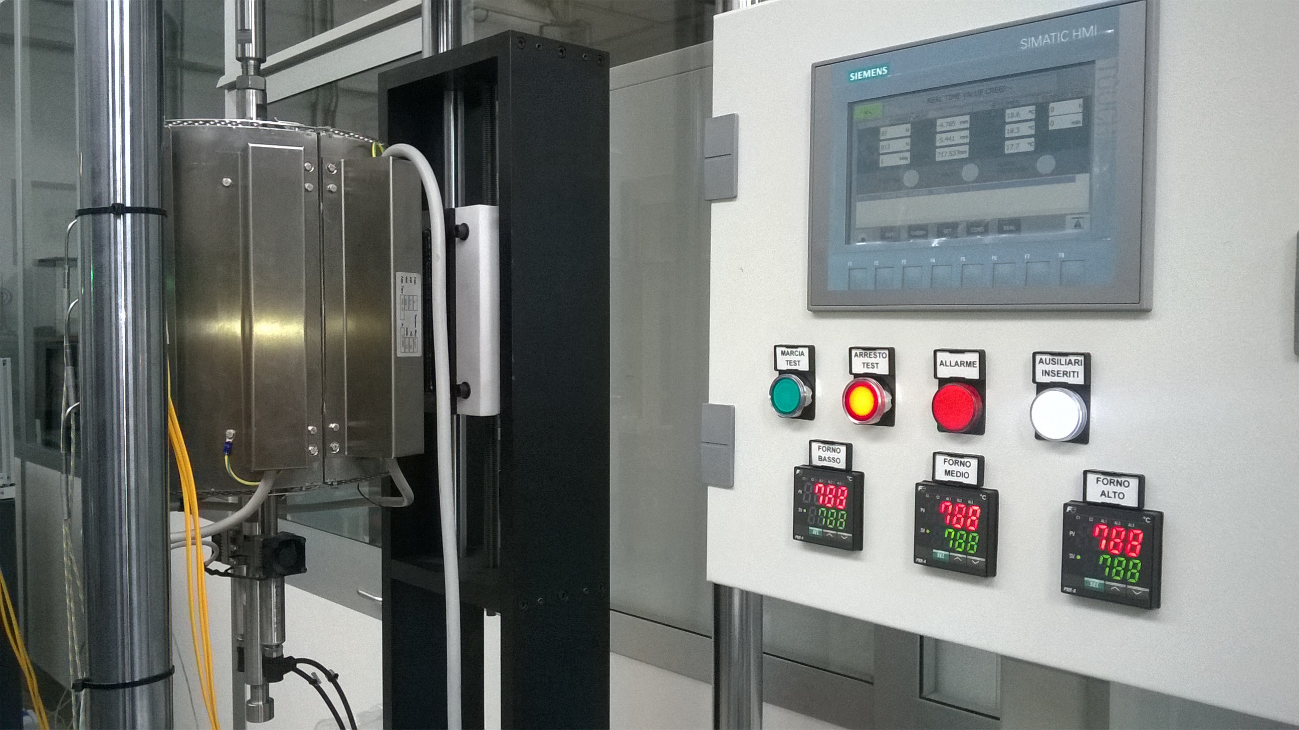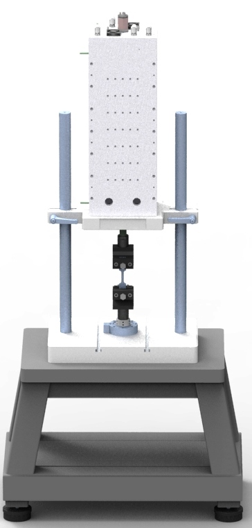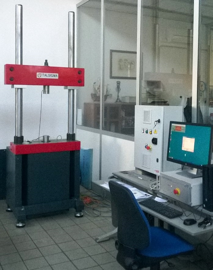 The machine consists of a frame with four high-rigidity columns sustained by anti-vibration supports. The actuator with servo-mechanical control for the application of the load is mounted on the lower base.