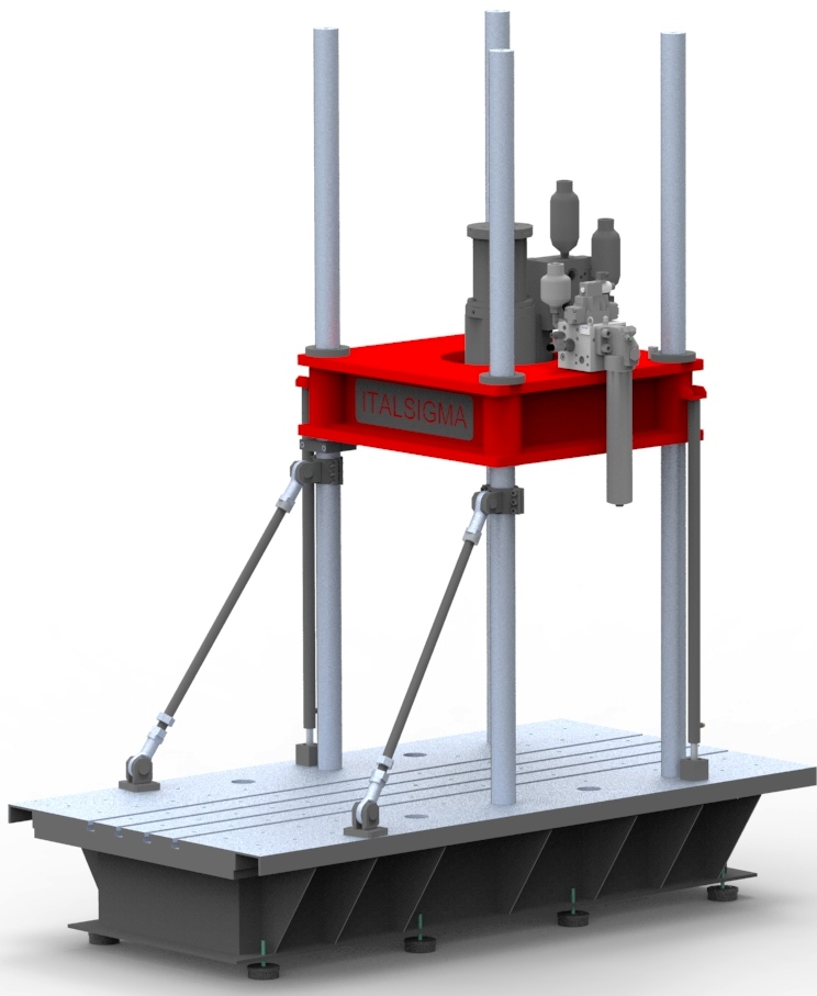 Four columns biaxial testing machine, designed for a vertical force of 500 kN and a horizontal force of 100 kN.