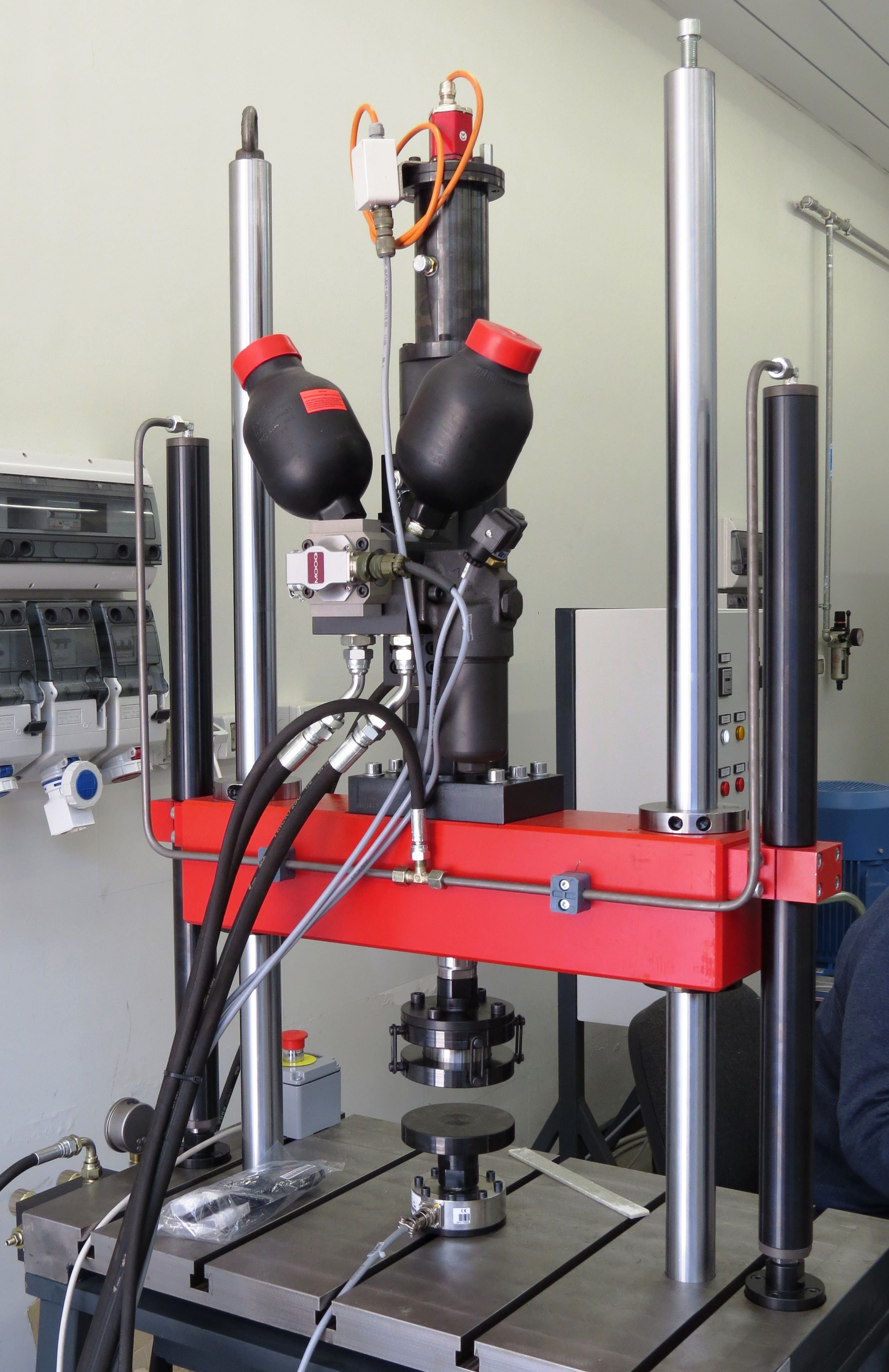 Two columns testing machine with a hydrostatic-bearing servo-cylinder mounted on the upper crossbeam and lower grooved base.