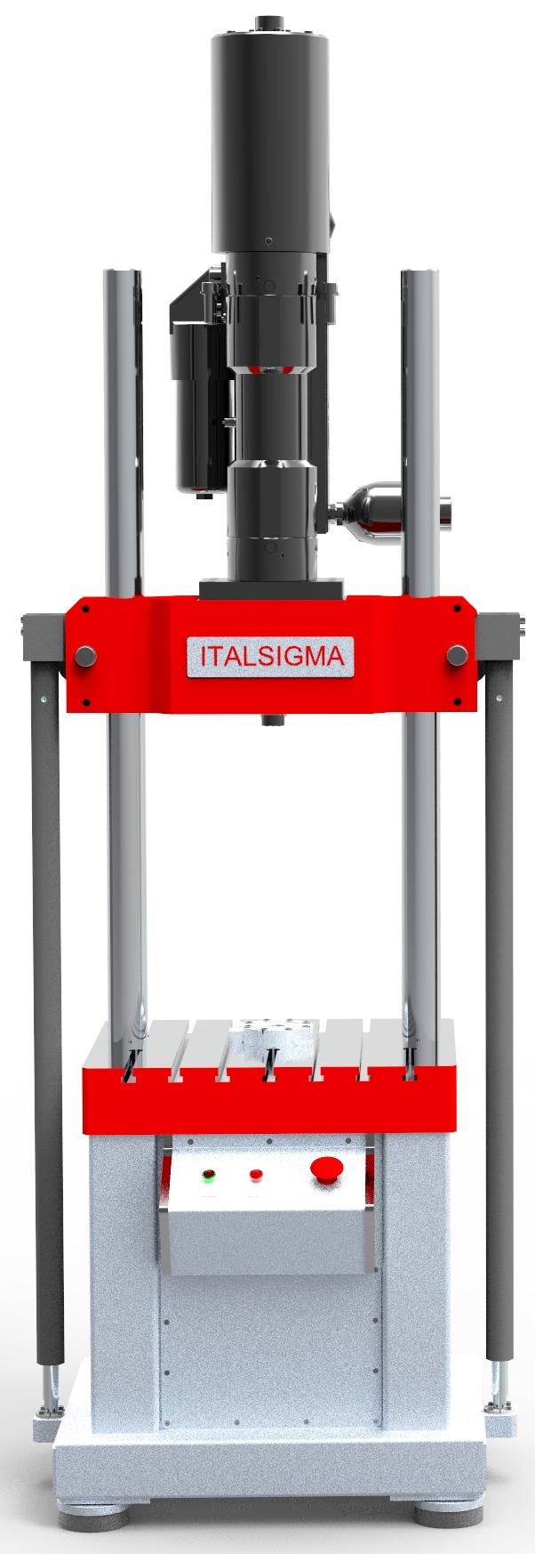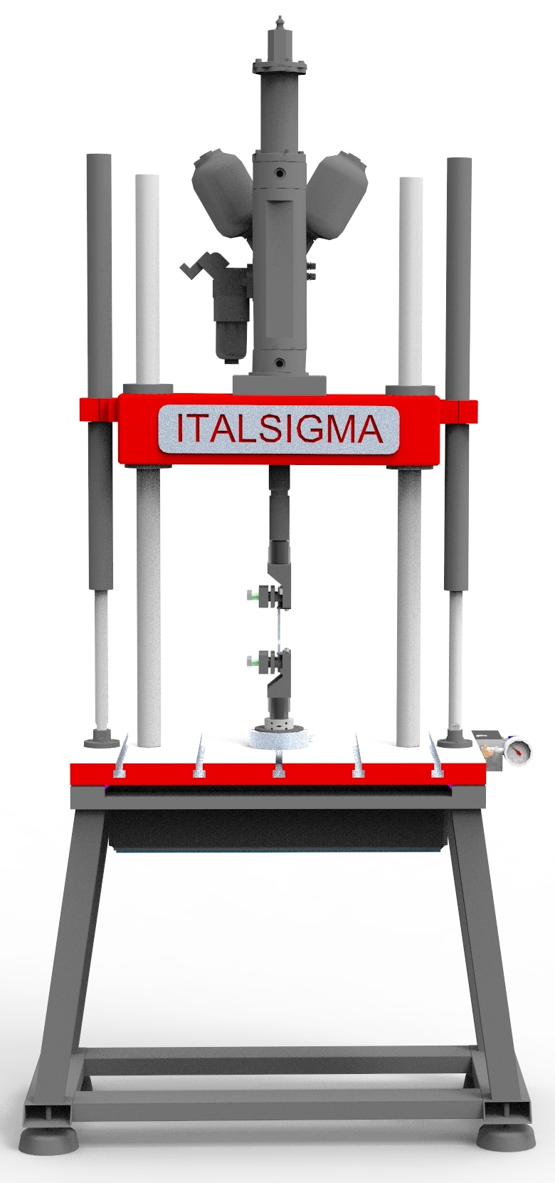 Two columns testing machine with a servo-cylinder mounted under the lower grooved base.