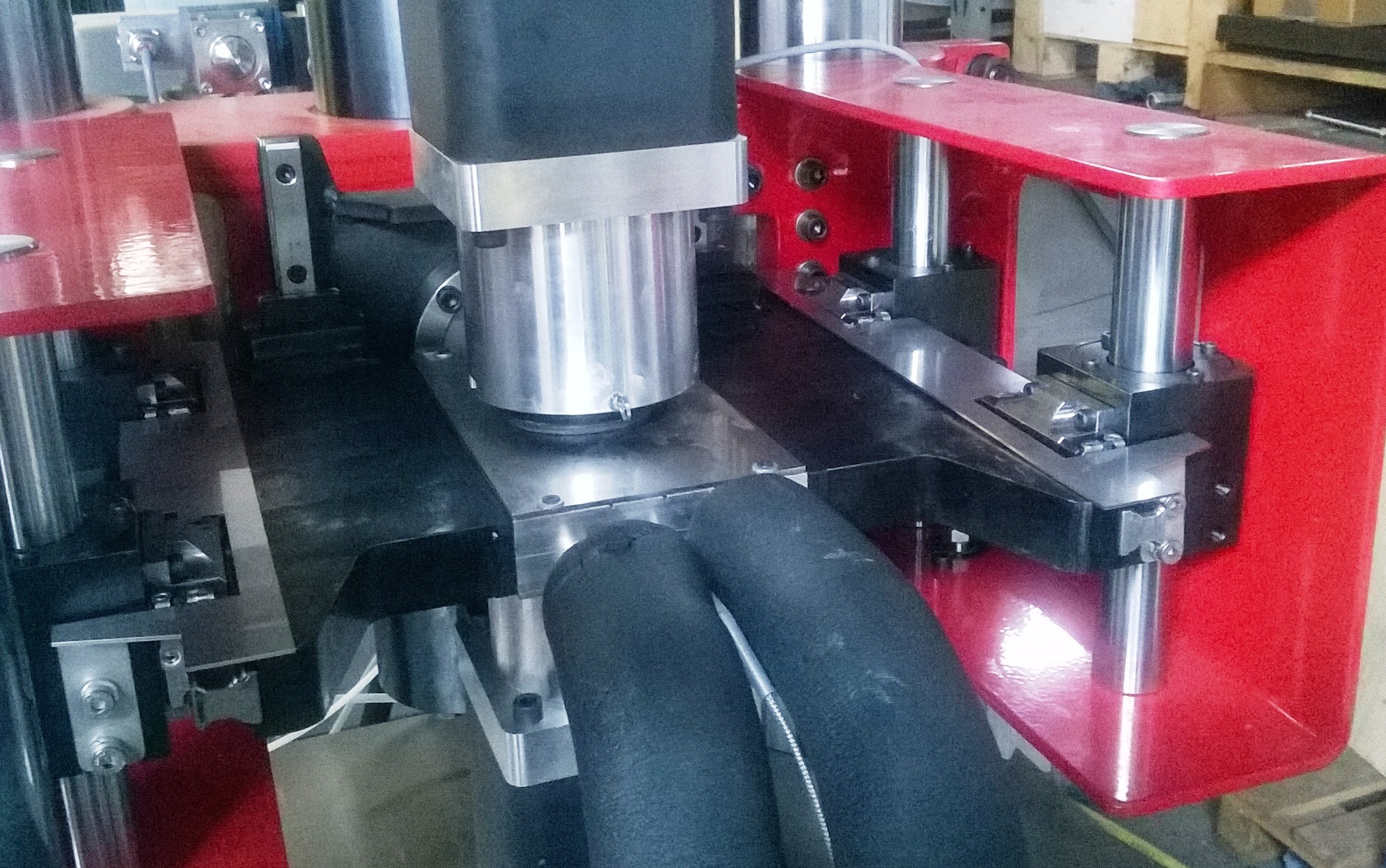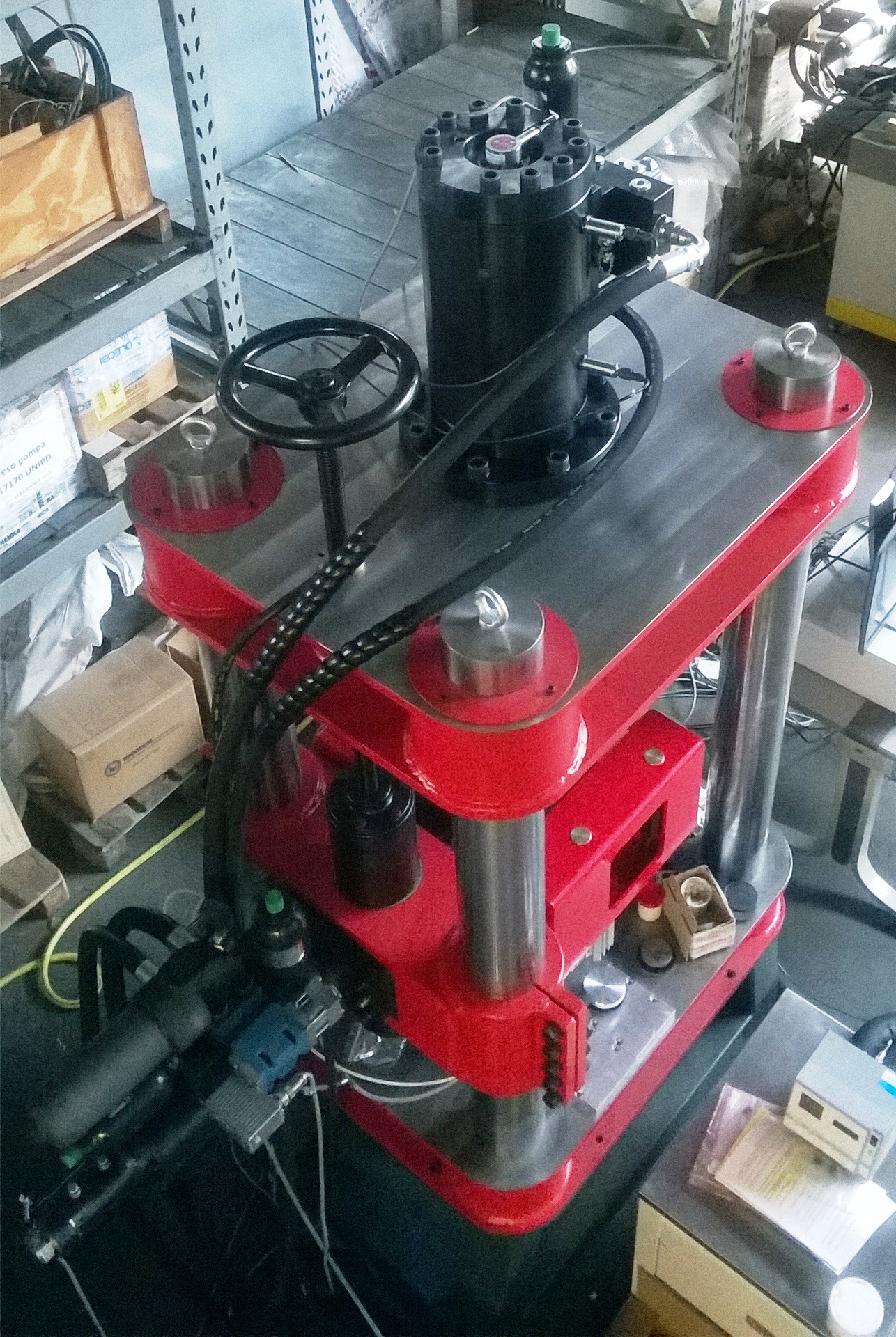 Four columns testing machine with lateral reinforcements on the columns and able to withstand the test loads without enduring deformations up to 500 kN.